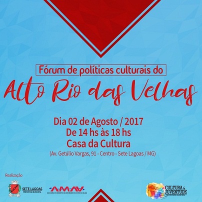 A prefeitura de Sete Lagoas, por meio da Secretaria Municipal de Cultura e Juventude, realiza o I Fórum de Políticas Culturais do Alto do Rio das Velhas. O evento acontece no dia 2 de agosto, a partir das 14h, na Casa da Cultura Francisco Timóteo Pereira. O secretário Angelo Oswaldo é um dos participantes.